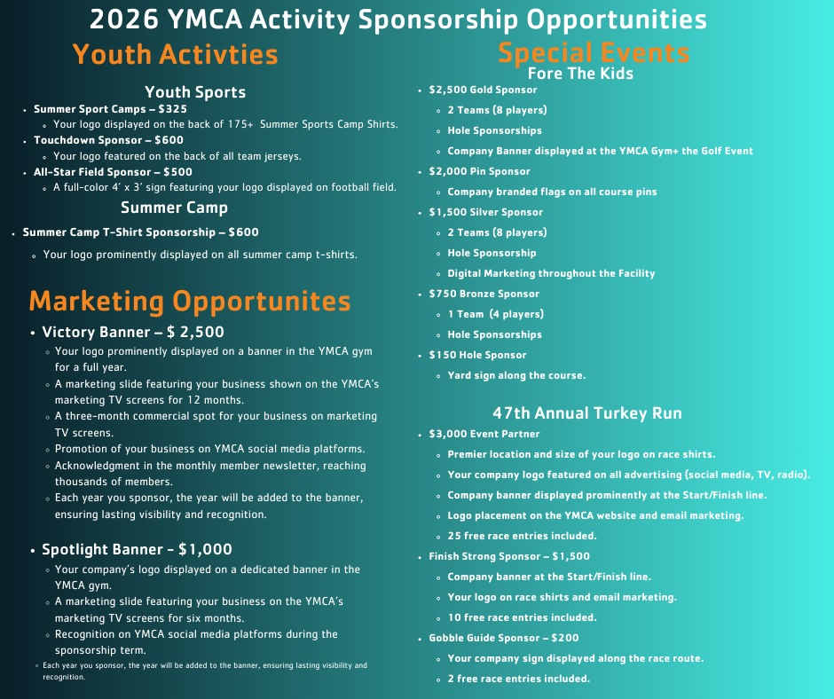 At the Quincy Family YMCA, we are committed to strengthening our community through youth development, healthy living, and social responsibility. Our 2026 Sponsorship Opportunities give businesses and individuals the chance to make a meaningful impact while gaining valuable community exposure.